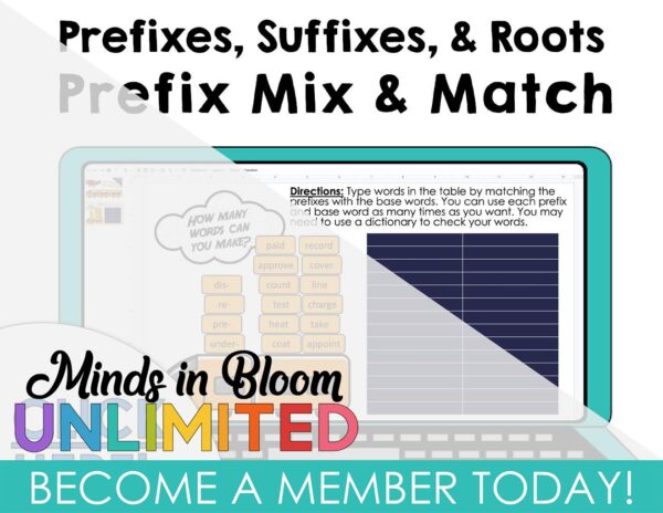 This digital resource focuses on prefix mix-up activities to help students practice prefixes, suffixes, and roots. Students will engage in interactive prefix matching exercises to strengthen their understanding of word parts. Teachers can incorporate this resource into their language arts centers or independent work to reinforce vocabulary skills and improve word recognition.