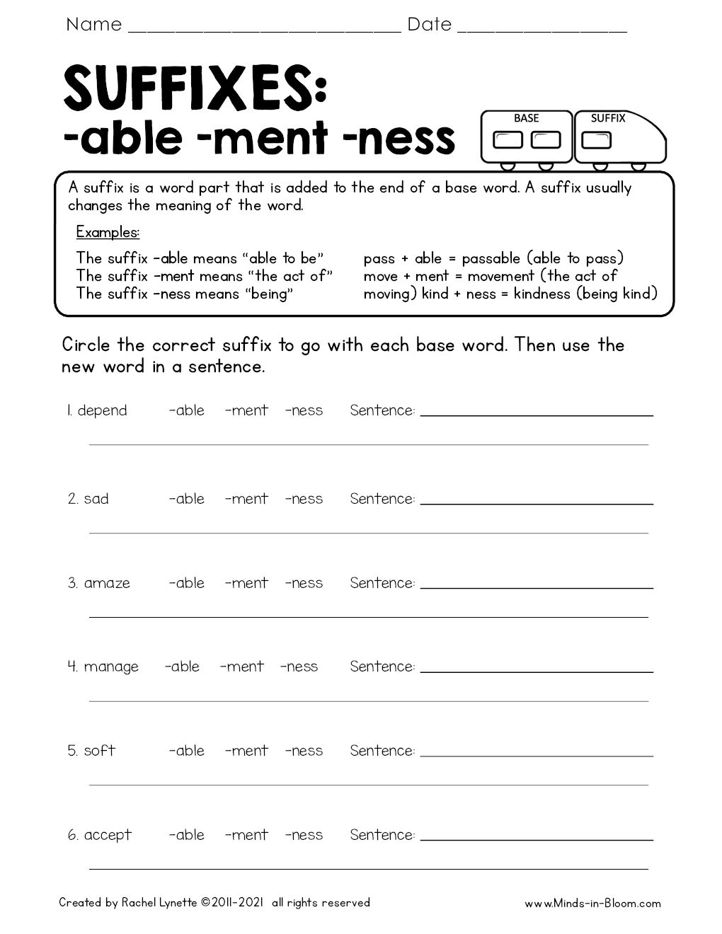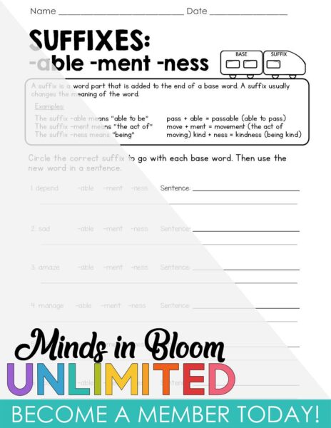 This printable resource focuses on suffix practice sentences for students learning about prefixes, suffixes, and roots. Suffixes such as -able, -ment, and -ness are explored through examples like “passable” and “movement.” Students will circle the correct suffix for given base words and then use them in sentences. Teachers can use this resource for independent work or as part of a small group activity to reinforce understanding of how suffixes change the meaning of words.